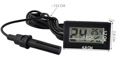Elektroniczny higrometr z termometrem z dużym wyświetlaczem LCD i sondą na długim kablu. Urządzenie charakteryzuje się dobrą rozdzielczością pomiaru i szybkością reakcji. Wystarczy położyć je na otwartej dłoni i niemal od razu widać reakcję przyrządu. Sonda (czujnik) może zostać umieszczona w dowolnym miejscu - akwarium, terrarium, lodówce, zamrażarce, szklarni itd. wszędzie tam, gdzie wystarczy zakres pomiaru temperatury w granicach od -50 st.C do 70 st.C.